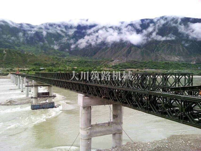 特點(diǎn):本鋼橋拉薩到林芝鐵路控制性工程的重要組成部分,滿足荷載80T施工車輛通行。主河道水流急,橋墩高,經(jīng)多方多次論證和設(shè)計(jì),最后采用了24+24+24+42+42+24M三排雙層單層混合型加強(qiáng)型雙橫梁下承式鋼橋??朔耸┕るy度大、氧氣較稀薄等因難因素,采用推出法安裝,于2015年6月通車。